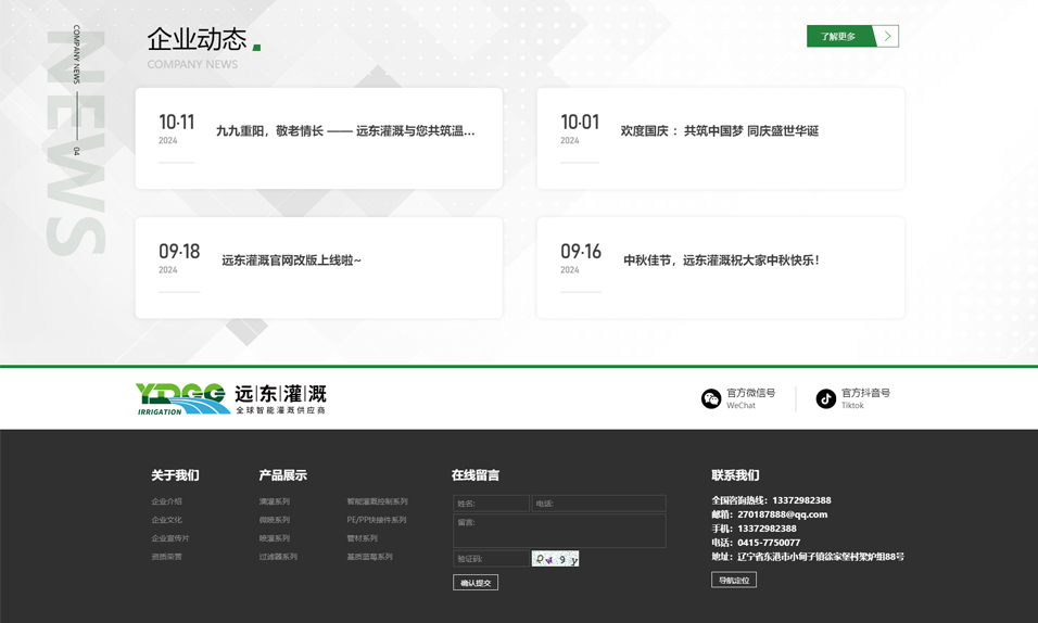 遼寧省東港市遠(yuǎn)東節(jié)水灌溉設(shè)備有限公司,成立于2011年,是集農(nóng)業(yè)灌溉設(shè)備研發(fā)、生產(chǎn)、銷售、服務(wù)為一體的國家高新技術(shù)企業(yè),企業(yè)資產(chǎn)近億元,占地面積16000㎡,現(xiàn)有員工100余人,其中科研營銷人員占30%。公司設(shè)有企業(yè)技術(shù)研究開發(fā)中心,并榮獲國家3A級信用企業(yè),專精特新企業(yè)、創(chuàng)新創(chuàng)業(yè)信用單位,以及ISO14001環(huán)境管理體系認(rèn)證、ISO9001質(zhì)量管理體系認(rèn)證、ISO45001職業(yè)健康安全管理體系認(rèn)證、國家涉及飲用水衛(wèi)生安全產(chǎn)品衛(wèi)生許可,持有發(fā)明專利32項(xiàng),軟件著作權(quán)30項(xiàng)。