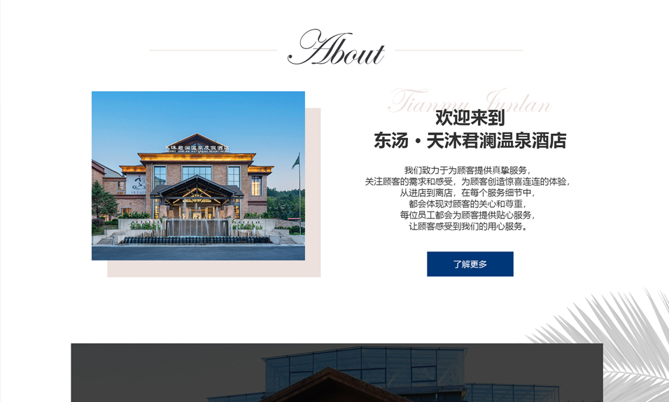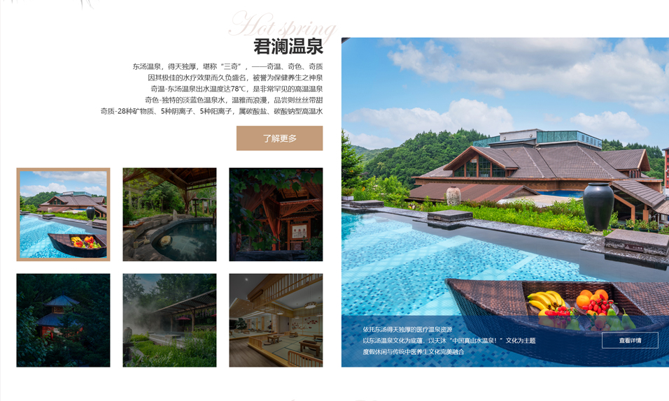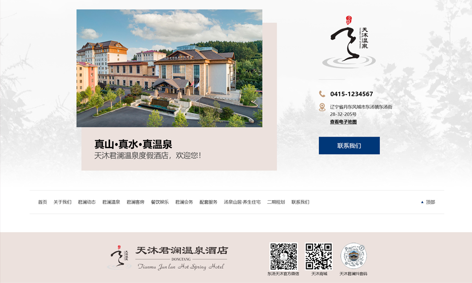 東湯天沐君瀾溫泉度假酒店位于遼寧省千年溫泉文化名城——東湯鎮(zhèn),是丹東市寶達房地產開發(fā)有限公司投資興建的一家集溫泉養(yǎng)生、酒店住宿、特色餐飲、休閑娛樂、商務會議于一體的綜合型溫泉度假酒店??傉嫉孛娣e 5 萬平米,周邊青山環(huán)繞、鳥語花香,環(huán)境極為愜意、自然。
